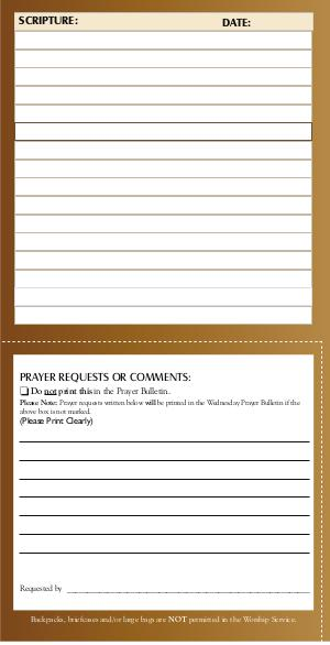 SCRIPTURE: DATE: PRAYER REQUESTS OR COMMENTS:  Do not print this in the Prayer Bulletin. Please Note: Prayer requests written below will be printed in the Wednesday Prayer Bulletin if the above box is not marked. (Please Print Clearly) Requested by _____________________________________________________________ Backpacks, briefcases and/or large bags are NOT permitted in the Worship Service.