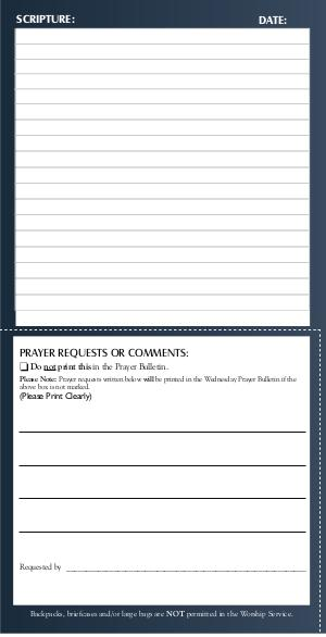 SCRIPTURE: DATE: PRAYER REQUESTS OR COMMENTS:  Do not print this in the Prayer Bulletin. Please Note: Prayer requests written below will be printed in the Wednesday Prayer Bulletin if the above box is not marked. (Please Print Clearly) Requested by _____________________________________________________________ Backpacks, briefcases and/or large bags are NOT permitted in the Worship Service.