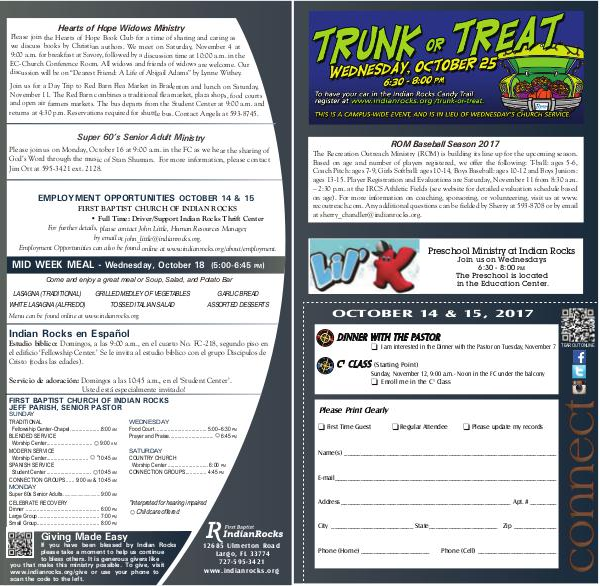 SATURDAY Worship Center.............................. Register at: www ☺ * 10:45. indianrocks am COUNTRY. org / CHURCH events / baby-dedication / 544 SPANISH SERVICE Student Center................................ ☺ 10: 45 am CONNECTION GROUPS...... 9:00 am & 10:45 am MONDAY Super 60s Senior Adults............................... 9:00 am