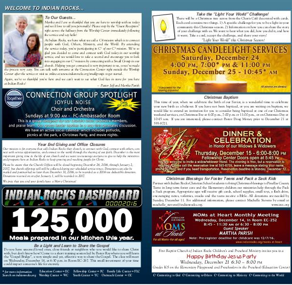 Our mission is for everyone that calls Indian Rocks their church, to connect with God, connect with others, connect with service opportunities, and connect to the world through the sharing of our faith. December is the most