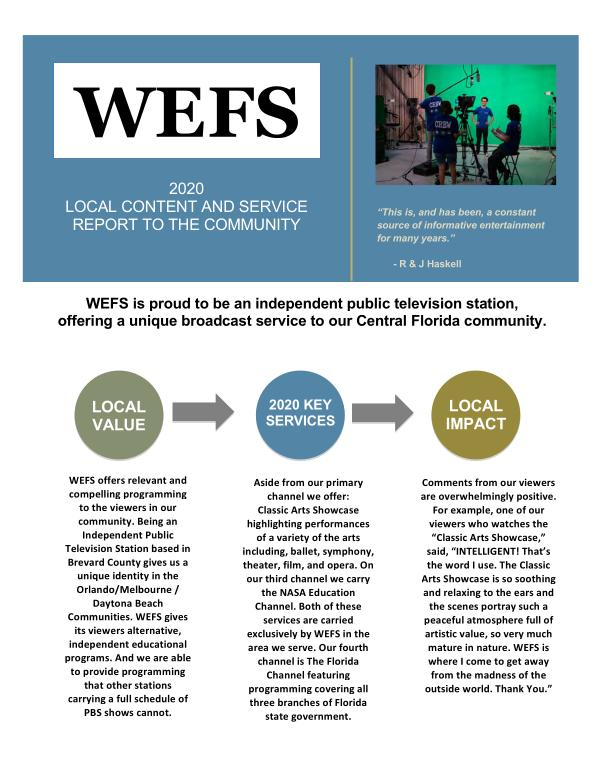 WEFS offers relevant and compelling programming to the viewers in our community . Being an Independent Public Television Station based in Brevard County gives us a unique identity in the Orlando / Melbourne / Daytona Beach Communities . WEFS gives its viewers alternative , independent educational programs . And we are able to provide programming that other stations carrying a full schedule of PBS shows cannot .