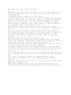 The‘ exercise causes weight loss’ myth 93 management, than most people can muster in their too busy lives. As you would have gathered by now, if too much of that elusive concept of‘ selfdiscipline’ is required then you might as well give up now. I believe that even if exercise at this level brought about triple the amount of weight loss, only those who found it intrinsically rewarding would be able to maintain it for the long-term. Remember our earlier discussion on human nature and self-discipline in Chapter 2? Humans need a degree of immediacy in the overall reward to keep motivated and two kilograms a year is not going to cut it. The good news, however, about exercising for weight loss is that, compared to the exercise of fitness training or muscle strengthening, it is much less demanding and painful. Many people balk at the prospect of exercising for weight loss because it conjures up images of gasping for air and burning muscle pain. Fortunately, brisk walking, the most effective of the‘ formal’ exercises for weight loss, is relatively painless. The role of exercise in maintaining weight loss There are benefits of exercise in terms of psychological and physical functioning. Exercise is effective in treating mild to moderate levels of anxiety and depression. Exercise undoubtedly improves our cardiovascular fitness, our body shape through muscle tone( an important issue for many people) and our stress management. In terms of weight, the main relationship between exercise and weight loss seems to be not with losing weight but keeping it off once we have lost it. Is this about burning off calories? If this was the case wouldn’ t it make a difference when we are trying to lose weight? No, when you look at the research, all that it says is that those who continue to exercise are more likely to keep their weight off. People sometimes confuse‘ causality’ with‘ association’. Just because people who exercise regularly keep their weight off does not mean that exercising is the cause of them keeping their weight off. Exercise and keeping weight off may be associated through the fact that they are both caused by something else. The majority of people who