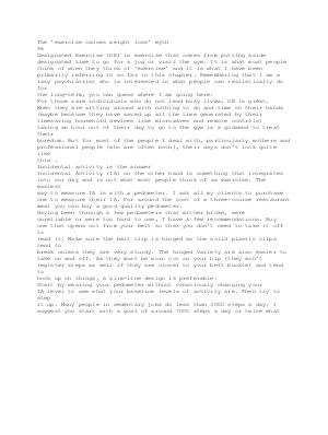 The‘ exercise causes weight loss’ myth 96 Designated Exercise( DE) is exercise that comes from putting aside designated time to go for a jog or visit the gym. It is what most people think of when they think of‘ exercise’ and it is what I have been primarily referring to so far in this chapter. Remembering that I am a lazy psychiatrist who is interested in what people can realistically do for the long-term, you can guess where I am going here. For those rare individuals who do not lead busy lives, DE is great. When they are sitting around with nothing to do and time on their hands( maybe because they have saved up all the time generated by their timesaving household devices like microwaves and remote controls) taking an hour out of their day to go to the gym is a godsend to treat their boredom. But for most of the people I deal with, particularly mothers and professional people( who are often both), their days don’ t look quite like this … Incidental activity is the answer Incidental Activity( IA) on the other hand is something that integrates into our day and is not what most people think of as exercise. The easiest way to measure IA is with a pedometer. I ask all my clients to purchase one to measure their IA. For around the cost of a three-course restaurant meal you can buy a good quality pedometer. Having been through a few pedometers that either broke, were unreliable or were too hard to use, I have a few recommendations. Buy one that opens out from your belt so that you don’ t need to take it off to read it. Make sure the belt clip is hinged as the solid plastic clips tend to break unless they are very sturdy. The hinged variety are also easier to take on and off. As they must be worn out on your hip( they won’ t register steps as well if they are closer to your belt buckle) and tend to hook up on things, a slim-line design is preferable. Start by wearing your pedometer without consciously changing your IA level to see what your baseline levels of activity are. Then try to step it up. Many people in sedentary jobs do less than 3000 steps a day. I suggest you start with a goal of around 7000 steps a day or twice what