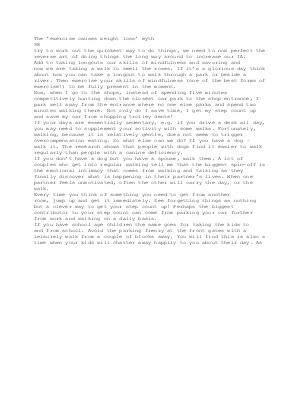 The‘ exercise causes weight loss’ myth 98 try to work out the quickest way to do things, we need to now perfect the reverse art of doing things the long way around to increase our IA. Add to taking longcuts our skills of mindfulness and savoring and now we are taking a walk to smell the roses. If it’ s a glorious day think about how you can take a longcut to walk through a park or beside a river. Then exercise your skills of mindfulness( one of the best forms of exercise!) to be fully present in the moment. Now, when I go to the shops, instead of spending five minutes competitively hunting down the closest car park to the shop entrance, I park well away from the entrance where no one else parks and spend two minutes walking there. Not only do I save time, I get my step count up and save my car from shopping trolley dents! If your days are essentially sedentary, e. g. if you drive a desk all day, you may need to supplement your activity with some walks. Fortunately, walking, because it is relatively gentle, does not seem to trigger overcompensation eating. So what else can we do? If you have a dog – walk it. The research shows that people with dogs find it easier to walk regularly than people with a canine deficiency. If you don’ t have a dog but you have a spouse, walk them. A lot of couples who get into regular walking tell me that the biggest spin-off is the emotional intimacy that comes from walking and talking as they finally discover what is happening in their partner’ s lives. When one partner feels unmotivated, often the other will carry the day, or the walk. Every time you think of something you need to get from another room, jump up and get it immediately. See forgetting things as nothing but a clever way to get your step count up! Perhaps the biggest contributor to your step count can come from parking your car further from work and walking on a daily basis. If you have school age children the same goes for taking the kids to and from school. Avoid the parking frenzy at the front gates with a leisurely walk from a couple of blocks away. You will find this is also a time when your kids will chatter away happily to you about their day. As