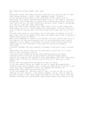 The‘ exercise causes weight loss’ myth 99 any parent knows, ask them two hours later and all you will get is that time honored answer,‘ Good’.‘ What happened today?’‘ Nothin.’ As the average step length can be considered to be around 0.66 or two-thirds of a metre, walking 9000 steps a day is the same as walking 6 kilometres. Six kilometres is a good hour of DE brisk walking. You will find that with not too much difficulty you can‘ hide’ these 6 kilometres in a day in a way that goes unnoticed. After you have either doubled your step count or hit 21,000 steps over three days, try to hit 30,000 steps over three days. I get my clients to look at habits they can get into that bring their step count up to this sort of level over three to six months. As we discussed in Chapter 2, think about what kind of strategic structures you might need to put in place to create these kinds of habits. Note this timeframe of three to six months. You will notice that this is the opposite of what most people start out doing and what most advice suggests. Do not expect to be able to maintain even 21,000 steps over three days for the long-term if you have not got your strategic structures in place. Perhaps the most powerful strategic structure to put in place is organizing your day so that you can walk part of your way to or from work or your children’ s school. I should finish though by saying that everyone should try more vigorous kinds of DE such as gym workouts, aerobic / hiphop dance classes and jogging. The reason is that some people find that they enjoy these forms of activity. Finding the motivation to exercise is much easier if you find the experience enjoyable in and of itself. If you are really lucky, you might be one of those who experience a‘ runners high’ with jogging. This is when you experience a narcotic like state from your endorphins without the expense or the fear of prosecution that goes with the narcotics! If you can manage it, the best time to walk, or even do DE, is in the evening, for two reasons – the‘ double whammy’. First, this is when we are most likely to eat. Most people consume 80 % of their daily calories between afternoon tea and bedtime. Exercising rather than eating is the