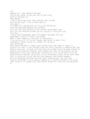 101 Chapter 10 – The Alcohol Paradox You’ re not drunk if you can lie on the floor without holding on. Dean Martin I don ' t drink any more than the man next to me, and the man next to me is Dean Martin. Joe Lewis It seems that researchers at Colorado University say wine may help people lose weight. It ' s not the wine directly that causes the weight loss. It ' s all the walking around you do trying to find your car. Jay Leno I only drink Champagne when I’ m happy, and when I’ m sad. Sometimes I drink it when I am alone. When I have company I consider it obligatory. I trifle with it if I’ m not hungry and drink it when I am. Otherwise I never touch it, unless I’ m thirsty. Lily Bollinger The French Paradox is never more interesting than when it comes to alcohol. In fact it was alcohol that was first thought to explain why the French could eat so much rich food and not suffer from the high levels of obesity and arterial disease that plague the rest of the western world. Wondering if this was the secret resulted in a lot of attention to the physiological effects of alcohol in its different forms. As we have seen, this is only one of the factors that explain the French Paradox As this research has been written about extensively over the last couple of decades I will simply summarize it quickly. There is no doubt that alcohol, in moderation, has health benefits. Some are attributable to