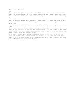 The Alcohol Paradox 105 at a restaurant planning to have the Caesar salad and after my second martini, oddly enough, I find myself ordering the creamy risotto. After the third I’ m telling them to just deep fry the whole kitchen and bring it out here!’ Just as alcohol makes more alcohol irresistible, it has the same effect on food. I have not seen the study, but I am sure that people are generally more likely to order the dessert they did not plan to have, after a few drinks. When I worked as a drink waiter during medical school one thing I learned really quickly was to get patrons their drinks promptly and keep them coming. Not only did they complain less if their food was late, but they ordered more and tipped more! So beware – order your food, including dessert, before you drink too much( or better still don’ t drink too much). If you are out with your partner or a friend enlist their support and have them on guard for you – but don’ t then ply them with drinks!