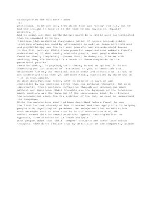 Carbohydrate: the Ultimate Hunter 111 particular, as he not only knew which food was‘ wrong’ for him, but he had the insight to know it at the time he was buying it. Equally politely, I had to point out that psychotherapy might be a little more sophisticated than he imagined it to be. I believe that marketing strategies( which of course include public relations strategies used by governments as well as large corporations) and psychotherapy are the two most powerful and misunderstood forces in the 21st century. While these powerful organizations embrace Freud’ s understanding of what really controls people, most people dismiss Freudian theory completely unaware that, in doing so, like me with smoking, they are handing their heads to these companies on the proverbial platter. Freudian theory, or psychodynamic theory is not an option. It is not something you can dismiss as irrelevant to you. It describes and delineates the way our emotional world works and controls us. If you do not understand this then you are more easily controlled by those who do – it is that simple. So what does Freudian theory say? In essence it says we are controlled by our emotions rather than our rational thoughts. But more importantly, these emotions control us through our unconscious mind without our awareness. While thoughts are the language of the conscious mind, emotions are the language of the unconscious mind. To influence the unconscious mind, the far mightier of the two, we need to understand its language. While the unconscious mind had been described before Freud, he was the first to look closely at how it worked and then apply this to helping people with psychological problems. He recognized that no matter how much we might want to know what is in our unconscious mind, we cannot access this information without special techniques such as hypnosis, free association or dream analysis. Most people think that their‘ deeper’ thoughts are their unconscious thoughts. They don’ t realize that by definition we are completely unable
