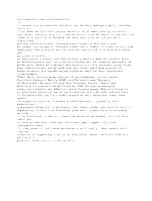 Carbohydrate: the ultimate hunter 112 to access our unconscious thoughts and beliefs through simply‘ thinking about it’. It is when we look back on our behavior in an embarrassing situation and think,‘ My God, why did I say / do that?’ that we begin to realize that there is a part of us running the show with whom we are not well acquainted. Why was Freud dismissed by mainstream thinking? Why isn’ t what he taught us, taught in schools? There are a number of views on this and exploring them fully is too far off the subject of this book but these are my views in brief. At the outset I should say that Freud, a doctor, and the world’ s first psychotherapist19 was not dismissed within his own medical specialty of psychiatry. While he had many detractors, his revolutionary views found many adherents who recognized that his ideas explained aspects of human behavior and psychological problems that had been previously inexplicable. Today there are two main schools of psychotherapy in the world: Cognitive Behavior Theory( CBT) and Psychodynamic Therapy. Psychodynamic Therapy evolved from Freudian Theory. While they have more in common than differences, CBT focuses on managing conscious thinking and behavior while Psychodynamic Theory’ s focus is on emotional learning during our formative years. 20 Both schools have 19 Psychiatrists can be broadly separated into those who treat such mental illnesses as, bipolar disorder & schizophrenia – primarily with medications – and psychotherapists, like myself, who treat conditions such as chronic depression, trauma & relationship problems – primarily with non-drug methods. 20 Unlike Freud, I see our formative years as extending into our late teens and our early twenties, although, with each year, especially after teenagehood sets in, the power of influence decreases significantly. Very recent brain imaging research is suggesting that at an anatomical level the brain does not mature at a physical level until our early 20’ s.