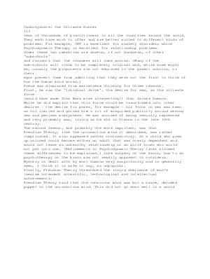 Carbohydrate: the Ultimate Hunter 113 tens of thousands of practitioners in all the countries around the world. They each have much to offer and are better suited to different kinds of problems. For example, CBT is excellent for anxiety disorders while Psychodynamic Therapy is excellent for relationship problems. Under these two umbrellas are dozens, if not hundreds, of other‘ subschools’ and variants that the consumer will come across.( Many of the sub-schools will claim to be completely original and, while some might be, usually the proponents are not educated in the parent schools, or their egos prevent them from admitting that they were not the first to think of how the human mind works.) Freud was dismissed from mainstream thinking for three reasons. First, he saw the‘ libidinal drive’, the desire for sex, as the ultimate force( would have made Star Wars more interesting!) that drives humans. While he did explain that this force could be transformed into other desires – the desire for power, for example – his focus on sex was seen as too limited and gained him a lot of misguided publicity around seeing sex and penises everywhere. He was accused of being sexually repressed and very probably was, living as he did in Vienna in the late 19th century. The second reason, and probably the more important, was that Freudian Theory, like the unconscious mind it described, was rather complicated. It also appeared rather contradictory. So a child who grew up unloved could become either an adult that was overly dependent and would not leave an unhealthy relationship or an aloof loner who would not get into one.( Refinements in Psychodynamic Theory later allowed these differences to be explained.) Like surgery on the brain, how to do psychotherapy on the brain was not readily apparent to outsiders. Mystery is dealt with by most humans very suspiciously and is generally seen, I think it is safe to say, as unpopular. Finally, Freudian Theory threatened the rising dominance of man’ s( sexism intended) scientific, technological and intellectual achievements. Freudian Theory said that the conscious mind was but a naïve, deluded puppet to the unconscious mind. This did not go down well in a world