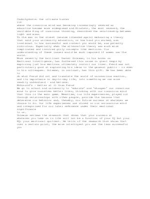 Carbohydrate: the ultimate hunter 114 where the conscious mind was becoming increasingly revered as education became more widespread and Einstein, the most revered, the veritable King of conscious thinking, described the relationship between light and mass. To the man in the street( sexism intended again) embracing a theory that said your university education, or how hard you worked, was irrelevant to how successful and content you would be, was patently ridiculous. Especially when the alternative theory was much more complicated and involved girly concepts like emotions. Our understanding of these issues would be much improved if women ran the world. More recently the brilliant Daniel Goleman, in his books on Emotional Intelligence, has furthered this cause in giant leaps by exploring just how emotions ultimately control our lives. Freud was not particularly good at explaining his ideas to the general public – or even to his colleagues. Goleman, in contrast, has this gift. He has been able to do what Freud did not and translate the world of unconscious emotion, and its importance in day-to-day life, into something we can more readily understand – and believe. McDonald’ s – better at it than Freud We go to school and university to‘ educate’ and‘ sharpen’ our conscious mind to give ourselves better lives, thinking with our conscious mind that this is the main game. Meantime, our life experiences, played out through relationships with other people, provide the lessons that determine our behavior and, thereby, our future success at whatever we choose to do. Our life experiences are stored in our unconscious mind and categorized for our later reference under their emotional significance to us. Goleman reviews the research that shows that your success at whatever you take on in life will not be a function of your IQ but your EQ: your emotional quotient. He tells of the research that shows that over a certain point, the more intelligent you are the less successful you