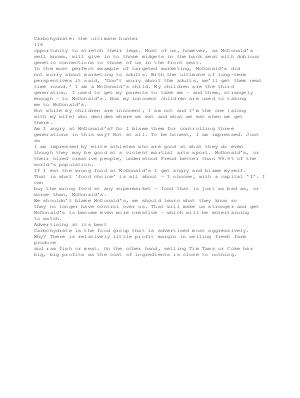 Carbohydrate: the ultimate hunter 116 opportunity to stretch their legs. Most of us, however, as McDonald ' s well knows, will give in to those midgets in the back seat with dubious genetic connections to those of us in the front seat. In the most perfect example of targeted marketing, McDonald’ s did not worry about marketing to adults. With the ultimate of long-term perspectives it said,‘ Don’ t worry about the adults, we’ ll get them next time round.’ I am a McDonald’ s child. My children are the third generation. I used to get my parents to take me – and them, strangely enough – to McDonald’ s. Now my innocent children are used to taking me to McDonald’ s. But while my children are innocent, I am not and I’ m the one( along with my wife) who decides where we eat and what we eat when we get there. Am I angry at McDonald’ s? Do I blame them for controlling three generations in this way? Not at all. To be honest, I am impressed. Just as I am impressed by elite athletes who are good at what they do even though they may be good at a violent martial arts sport. McDonald’ s, or their hired creative people, understood Freud better than 99.9 % of the world’ s population. If I eat the wrong food at McDonald’ s I get angry and blame myself. That is what‘ food choice’ is all about – I choose, with a capital‘ I’. I can buy the wrong food at any supermarket – food that is just as bad as, or worse than, McDonald ' s. We shouldn’ t blame McDonald ' s, we should learn what they know so they no longer have control over us. That will make us stronger and get McDonald ' s to become even more creative – which will be entertaining to watch. Advertising at its best Carbohydrate is the food group that is advertised most aggressively. Why? There is relatively little profit margin in selling fresh farm produce and raw fish or meat. On the other hand, selling Tim Tams or Coke has big, big profits as the cost of ingredients is close to nothing.