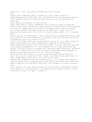 Using GL to sort the good, the bad and the suicidal 122 People with diabetes need to generally lower their intake of carbohydrate-rich foods that will be broken down into glucose because their reduced levels of insulin mean they are not as effective at reducing high levels of glucose in their blood. Those who have to inject themselves with insulin( Type 1 Diabetes) need to know which foods will significantly increase their blood glucose so they can compensate for this by increasing their dose of insulin. Out of the need to understand the GI of different foods a lot of research has gone into this field in recent years. Most of it has been done by two groups of researchers, one in Australia at Sydney University and the other at Toronto University in Canada. Each food studied was given a number and this was called its GI. The GI of a given food was calculated by giving it to a small group of human guinea pigs and then taking blood samples to measure the resulting blood glucose over the next couple of hours. The GI was then calculated by comparing it to a standard, set at 100, which was the amount of blood glucose increase that resulted from drinking a standard amount of liquid glucose. Over the years researchers have amassed an enormous data bank with GIs for all sorts of foods. But what does this have to do with losing weight? The glucose we don’ t burn up is turned into fat. Today, we create much more body fat from carbohydrate than we do from fat in our diet. Second, and somewhat more controversially, it is argued that because insulin stops cells from burning fat we should avoid eating foods that have a high GI and therefore stimulate the release of insulin because this will prevent our body from burning off fat. High GI carbohydrates may also‘ wear out’ our pancreas – the organ that produces insulin – and increase the risk of Type 2 Diabetes.