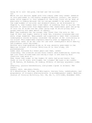 Using GL to sort the good, the bad and the suicidal 123 While not all doctors agree with this theory some very recent research on rats published in the highly respected medical journal, the Lancet, gives solid support to this argument. 21 The study could not be done as precisely on humans because the two groups needed to be given exactly the same number of calories and research shows, as we discussed in Chapter 5, that humans have a bad habit of sneaking food in any but the shortest of restricted food experiments! The researchers gave one group of rats low GI foods and the other group high GI while giving both groups exactly the same amount of energy. When they examined the two groups they found that the rats on the high GI diet had higher levels of body fat, elevated triglycerides and early stage diabetes. Many people are surprised to hear that increased carbohydrate intake actually increases the amount of fat circulating in our blood! This experiment explains exactly what is happening at a population level as we eat less fat and more carbohydrate while obesity and diabetes rates skyrocket. Another very high-powered study on GI was recently published in the American Journal of Clinical Nutrition. 22 In this study, 235 postmenopausal women were followed for three years and then, rather invasively, the arteries around their hearts were examined by injecting dye into their bloodstream and taking x-rays to see exactly what condition they were in. They found that women on the higher GI diets had worse hearts than those on low GI diets with higher fat intakes! We have to be careful 21 DB Pawlak, JA Kushner, DS Ludwig. Effects of dietary glycaemic index on adiposity, glucose homoeostasis, and plasma lipids in animals. The Lancet. London, 2004. 364; 9436; 778-85. 22 D Mozaffarian, EB Rimm, DM Herrington. Dietary fats, carbohydrate, and progression of coronary atherosclerosis in postmenopausal women. American Journal of Clinical Nutrition, Vol. 80, No. 5, 1175-1184, November 2004.