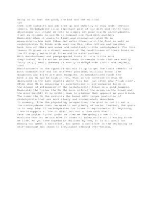 Using GL to sort the good, the bad and the suicidal 125 them like calories and add them up and then try to stay under certain limits. Carbohydrate is an important part of our diet and rather than decreasing our intake we need to simply eat more low GL carbohydrates. I get my clients to use GL to compare one food with another. Basically when it comes to fruit and vegetables, what GL is measuring is how much fibre and water there is in the food as well as carbohydrate. So foods with very low GLs, like lettuce and pumpkin, have lots of fibre and water and relatively little carbohydrate. For this reason GL gives us a direct measure of the healthiness of these foods as low GL simply means high fibre and / or water content. With manufactured and pre-prepared foods it is a little more complicated. While mother nature tends to create foods that are mostly fatty( e. g., meat, cheese) or mostly carbohydrates( fruit and vegies), food manufacturers do the opposite and mix it up to get the taste benefit of both carbohydrate and fat wherever possible. Suicidal foods like doughnuts and fries are good examples. So manufactured foods may have a low GL and be high in fat. This is the converse of what we discussed in the last chapter where‘ low fat’ can often mean‘ high carb’. Often what GL is measuring in manufactured or pre-prepared foods is the degree of refinement of the carbohydrate. Bread is a good example. Basically the higher the GL the more refined the grain in the bread and the more quickly it is broken down to glucose that appears in your blood. The lower the GL the grainier the bread with larger particles of carbohydrate that are more slowly and incompletely absorbed. In summary, from the physiology perspective, the goal is not to eat a low carbohydrate diet: we need to eat plenty of carbs. Instead, the goals is to swap high GL carbohydrates for lower GL equivalents. If anything, I would support a‘ low GL diet’ but not a‘ low carb diet’. From the psychological point of view we are going to use GL to evaluate how far we can move to lower GL foods while still eating foods we like. As you have hopefully realized by now, it is all about not making too great a sacrifice. Too great a sacrifice is the beginning of self-sabotage and leads to inevitable rebound over-eating.