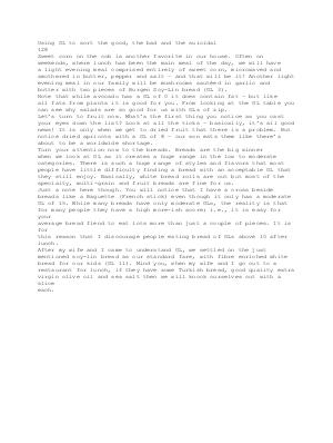 Using GL to sort the good, the bad and the suicidal 128 Sweet corn on the cob is another favorite in our house. Often on weekends, where lunch has been the main meal of the day, we will have a light evening meal comprised entirely of sweet corn, microwaved and smothered in butter, pepper and salt – and that will be it! Another light evening meal in our family will be mushrooms sautéed in garlic and butter with two pieces of Burgen Soy-Lin bread( GL 3). Note that while avocado has a GL of 0 it does contain fat – but like all fats from plants it is good for you. From looking at the GL table you can see why salads are so good for us with GLs of zip. Let’ s turn to fruit now. What’ s the first thing you notice as you cast your eyes down the list? Look at all the ticks – basically, it’ s all good news! It is only when we get to dried fruit that there is a problem. But notice dried apricots with a GL of 8 – our son eats them like there’ s about to be a worldwide shortage. Turn your attention now to the breads. Breads are the big winner when we look at GL as it creates a huge range in the low to moderate categories. There is such a huge range of styles and flavors that most people have little difficulty finding a bread with an acceptable GL that they still enjoy. Basically, white bread rolls are out but most of the specialty, multi-grain and fruit breads are fine for us. Just a note here though. You will notice that I have a cross beside breads like a Baguette( French stick) even though it only has a moderate GL of 15. While many breads have only moderate GLs, the reality is that for many people they have a high more-ish score; i. e., it is easy for your average bread fiend to eat lots more than just a couple of pieces. It is for this reason that I discourage people eating bread of GLs above 10 after lunch. After my wife and I came to understand GL, we settled on the just mentioned soy-lin bread as our standard fare, with fibre enriched white bread for our kids( GL 11). Mind you, when my wife and I go out to a restaurant for lunch, if they have some Turkish bread, good quality extra virgin olive oil and sea salt then we will knock ourselves out with a slice each.