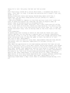 Using GL to sort the good, the bad and the suicidal 136 Flat Food Larry called me a little while back. I answered the phone to hear,‘ Your diet is crap. I’ ve been eating pizza and I haven’ t lost any weight at all.’ Having lived with Larry and having shared many meals with him I asked him,‘ So how many large pizzas are you eating at a meal?’‘ Two,’ he replied. I gently proceeded to explain to him that portion size still rules and none of these principles can overcome the laws of physics when we flaunt them so blatantly and so disrespectfully. Pizza, like bread and cheap chocolate, has a very high more-ish rating – it is the kind of food that leaves you wanting more. You need to know which foods you find to be very more-ish and avoid them, or, if they are a high sacrifice food, look at having them in the first half of the day after a big breakfast. So spend some time looking at which of the lower GL foods suit your tastes. Whether you are buying a complete meal or buying ingredients, the battle is won or lost at the shops. Once your fridge and pantry have those fattening foods in them the game is over, the battle is lost. The role of meal replacements Initially I was not keen on using meal replacements because they denied the person that all important experience of the meal ritual. In particular they deny the opportunity to do some chewing and have the time out and social interaction that a real meal offers. While many people lose weight by just applying the principles outlined in this book, many people need more help. Rather than aggressive options like drugs or surgery, my first preference for greater weight loss is the smart use of meal replacements. For many of us, the total visual / chewing / crunching experience, not to mention the taste experience, is the real point of a meal. Excessive deprivation of this very human experience can trigger rebound overeating. Research shows that heavy reliance upon meal replacements( i. e. replacing three meals a day) could lead to increased binge eating. It’ s not