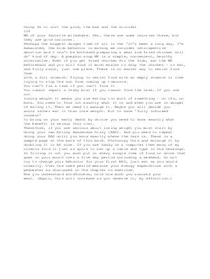 Using GL to sort the good, the bad and the suicidal 139 MR of your favorite milkshake. Yes, there are some calories there, but they are good calories. Perhaps the biggest danger time of all is the‘ it’ s been a long day, I’ m exhausted, the kids behavior is making me consider retrospective abortion and I can’ t be bothered preparing a meal and fried chicken will do’ kind of day. A pumpkin soup MR is a simple, convenient, healthy alternative. Even if you get fried chicken for the kids, eat the MR beforehand and you will find it much easier to skip the chicken – or eat, and fully savor, just one piece. There is no easier way to resist food than with a full stomach. Trying to resist food with an empty stomach is like trying to stop the sun from coming up tomorrow. You can’ t fix a leak if you can’ t find it You cannot repair a leaky boat if you cannot find the leak. If you are not losing weight it means you are eating too much of something – no ifs, no buts. You need to find out exactly what it is and when you are in danger of eating it. Then we need to manage it. Maybe you will decide you would rather eat it than lose weight. But to have‘ fully informed consent’ to bring on your early death by choice you need to know exactly what the benefit is versus this cost. Therefore, if you are serious about losing weight you must start by doing your own Eating Awareness Diary( EAD). And you need to repeat doing your EAD until you know exactly where the leak is. There is a sample page at the back of this book. Photocopy this and enlarge it by doubling it to A4 size. If you are handy on a computer then many of my clients find it just as quick to set up a table and type in the headings. In filling it out you must put in every single item of food or drink that goes in your mouth over a five day period including a weekend. Do not try to change your behavior for your first EAD, just eat as you would normally. Over the same period measure your energy expenditure with a pedometer as discussed in the chapter on exercise. Now you understand mindfulness, note how much you savored your meal.( Again, this will increase as you observe it, by definition.)