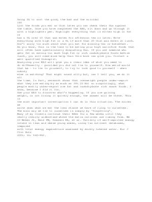Using GL to sort the good, the bad and the suicidal 140 List the foods you eat so that later you can check their GLs against the table. Once you have completed the EAD, sit down and go through it with a highlighter pen. Highlight everything that is either high in fat or has a GL over 10 that was eaten for afternoon tea or later. Note everything with high fat or a GL of more than 20 that was eaten at lunch. Don’ t worry too much about what you eat for morning tea or breakfast. As you know, this is the time to be eating your high sacrifice foods that will often have spectacularly disgusting GLs. If you are someone who gets fat on eating too much high fat or rich carbohydrate foods before lunch, you will need more help than this book can give you. Contact a well qualified therapist. Analyzing your EAD will give you a clear idea of what you need to do differently – provided you did not lie to yourself. How weird would that be – to lie to yourself, to try to look good to yourself – when nobody else is watching! That might sound silly but, can I tell you, we do it all the time. In fact, research shows that overweight people under-report what they are eating by as much as 39 %. 23 Not so surprisingly, what people mostly under-report are fat and carbohydrate rich snack foods. I know, because I did it too. Use your EAD to discover what’ s happening. If you are gaining weight, or not losing it quickly enough, the answer will be there. This is the most important investigation I can do in this situation. The sooner we write down what we eat the less chance we have of lying to ourselves. The main way we lie to ourselves is simply by‘ forgetting’. Many of my clients continue their EADs for a few weeks until they really clearly understand where the extra calories are coming from. We 23 Weber JL, Reid PM, Greaves KA, et al. Validity of self-reported energy intake in lean and obese young women, using two nutrient databases, compared with total energy expenditure assessed by doubly labeled water. Eur J Clin Nutr 2001; 55: 940-950.