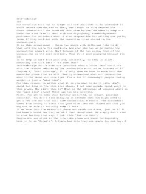 Self-sabotage 144 Our conscious mind has to forget all the unwritten rules otherwise it would become overwhelmed as every new lesson or rule crowded our consciousness with the hundreds that came before. We need to keep our conscious mind free to deal with our day-by-day, moment-by-moment problems. Our conscious mind is also responsible for setting our goals,( even if they conflict with the unwritten rules stored in the unconscious). It is this arrangement – these two minds with different jobs to do – that sets the scene for conflict. And when the two go to battle the unconscious always wins. Why? Because of the two roles, that of the unconscious is the more critical. Thus it is more powerful because its job is to keep us safe from pain and, ultimately, to keep us alive. Executing the nice idea –‘ failure fear’ Self-sabotage occurs when our conscious mind’ s‘ nice idea’ conflicts with the lessons learned by our unconscious mind. As we touched on in Chapter 6,‘ Goal Sabotage’, it is only when we have to move into the execution phase that we will finally understand what our unconscious mind thinks about our nice idea. For a lot of overweight people losing weight is just a‘ nice idea’. For this reason, no matter what it is you want to do in life, don’ t spend too long in the nice idea phase. I see some people spend years in this phase. Why might this be? What is the advantage of staying stuck in the‘ nice idea’ phase? There are two big benefits. First, you get to keep your fantasy untainted, in dreamy, pristine condition. You don’ t risk damaging it because then you might need to get a new one and that will take uncomfortable effort. The discomfort comes from having to admit that your nice idea was flawed and that you may not be able to actually make it work. If we move into the execution phase and crash our dream, just as if it had been a brand new car, we will feel devastated. We simply don’ t want to risk feeling that way. I call this‘ failure fear’. People who are stuck in the nice idea phase are known colloquially here in Oz as‘ Gunna’ s’. A Gunna has lots they are gunna do, one day. A