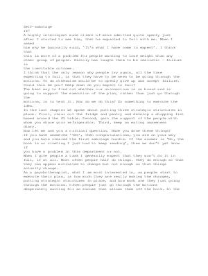 Self-sabotage 147 A highly intelligent male client of mine admitted quite openly just after I started to see him, that he expected to fail with me. When I asked him why he basically said,‘ It’ s what I have come to expect’. I think that this is more of a problem for people wanting to lose weight than any other group of people. History has taught them to be realistic – failure is the inevitable outcome. I think that the only reason why people try again, all the time expecting to fail, is that they have to be seen to be going through the motions. To do otherwise would be to openly give up and accept failure. Could this be you? Deep down do you expect to fail? The best way to find out whether our unconscious is on board and is going to support the execution of the plan, rather than just go through the motions, is to test it. How do we do this? Do something to execute the idea. In the last chapter we spoke about putting three strategic structures in place. First, clear out the fridge and pantry and develop a shopping list based around the GL table. Second, gain the support of the people with whom you share your refrigerator. Third, keep an eating awareness diary. Now let me ask you a critical question. Have you done these things? If you have answered‘ Yes’, then congratulations, you are on your way and you have cleared the first sabotage hurdle. If the answer is‘ No, the book is so riveting I just had to keep reading’, then we don’ t yet know if you have a problem in this department or not. When I give people a task I generally expect that they won’ t do it in full, if at all. Most often people half do things. They do enough so that they can appear motivated to change but not enough so that things actually change. As a psychotherapist, what I am most interested in, as people start to execute their plan, is how much they are really making the changes, putting strategic structures in place, and how much are they just going through the motions. Often people just go through the motions desperately waiting for an excuse that allows them off the hook. In the