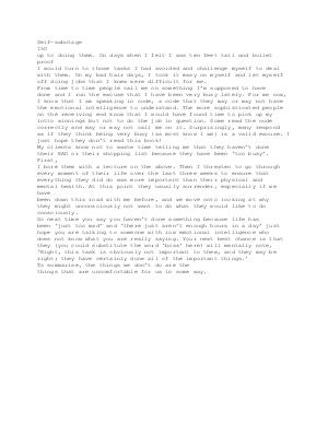 Self-sabotage 150 up to doing them. On days when I felt I was ten feet tall and bullet proof I would turn to those tasks I had avoided and challenge myself to deal with them. On my bad hair days, I took it easy on myself and let myself off doing jobs that I knew were difficult for me. From time to time people call me on something I’ m supposed to have done and I run the excuse that I have been very busy lately. For me now, I know that I am speaking in code, a code that they may or may not have the emotional intelligence to understand. The more sophisticated people on the receiving end know that I would have found time to pick up my lotto winnings but not to do the job in question. Some read the code correctly and may or may not call me on it. Surprisingly, many respond as if they think being very busy( as most know I am) is a valid excuse. I just hope they don’ t read this book! My clients know not to waste time telling me that they haven’ t done their EAD or their shopping list because they have been‘ too busy’. First, I bore them with a lecture on the above. Then I threaten to go through every moment of their life over the last three weeks to ensure that everything they did do was more important than their physical and mental health. At this point they usually surrender, especially if we have been down this road with me before, and we move onto looking at why they might unconsciously not want to do what they would like to do consciously. So next time you say you haven’ t done something because life has been‘ just too mad’ and‘ there just aren’ t enough hours in a day’ just hope you are talking to someone with low emotional intelligence who does not know what you are really saying. Your next best chance is that they( you could substitute the word‘ boss’ here) will mentally note,‘ Right, this task is obviously not important to them, and they may be right; they have certainly done all of the important things.’ To summarise, the things we don’ t do are the things that are uncomfortable for us in some way.