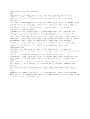 Obesity-proofing our children 168 Parenting is all about instilling long-term healthy behaviors in children and the conflict around this is immense and will occur on and off for their entire childhood. Being prepared to enter into this conflict is the first responsibility of bringing a child into the world. There is no better example of this love than when it comes to instilling healthy eating habits in our children. We will come back to this issue when we discuss how love is not a feeling a little later in the chapter. The gift of indoctrination Children are our future. That is undoubtedly true, but I have my own reason for writing this chapter. Most people who come to see me are roughly middle-aged – from 35 to 50. They often lament, as I used to, that they wished they had gotten therapy when they were in their early twenties. In this way, they could have avoided a decade or two of painful stumbling around trying to make sense of life and relationships. I say,‘ I used to’ because then I saw a couple of twenty-somethings and I realized that at that age they were not really that concerned about their life not working out. Therapy was irrelevant because at twentysomething they felt they had lots of time to sort things out – a couple of decades in fact! Just like teenagers really – only not quite so rude and rebellious. And so I have come to appreciate that once a child turns 13, or thereabouts, their capacity to be influenced diminishes greatly for the next twenty or thirty years. Habits, values and beliefs established before their 13th year can become lifelong. After that point in time it becomes much more difficult( albeit not impossible) to change or develop new habits. We often think of indoctrination as bad, like brainwashing. But what if we use this force in the name of good rather than evil! The truth is that parents and others – at school or in the media – indoctrinate children with all sort of beliefs and habits in their formative years. This is why they are called‘ formative years’.