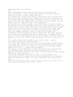 Obesity-proofing our children 171 Not unreasonably, people often ask me what do my wife and I do with our children – offer them unlimited amounts of sweet food? No. Basically we have a pretty simple approach. Our children are allowed less healthy, fattening foods only after they eat good serves of healthy food. Perhaps the most difficult balance is with highly refined carbohydrates and sugar as found in sweets and soft drinks. But even with these foods( using the word very loosely) we are conscious not to‘ deprive’ them of the experience. Soft drinks are a major problem in the causation of childhood obesity. A number of studies have singled them out to target because of their high energy density, their ready availability and the ease with which large amounts can be drunk quickly. To deal with soft drinks we keep their favorite juices at home and allow them to make smoothies( based on milk) and frappés( based on juice) as they like. As these are fundamentally more interesting tasting drinks than soft drink when we go out they will preferentially have a smoothie or a frappés and only have soft drink when these options are not available. On these occasions, however, we will limit them to only one glass of soft drink and then it is on to water. Sweets are allowed once or twice a week – usually purchased with hoarded tuck-shop money. It is very gratifying now( at the time of writing they are aged 15 and 12) to see that when we sit down in a café our daughter asks if they do milkshakes made on real milk, while our son asks if they make frappes based on real fruit – indoctrination complete! The reality is that depriving a child of a particular food gives that food enormous power. Deprivation sends the message this food is special. Then, when the child sees other children eating it the follow-on message is,‘ What about me!’ I was quietly pleased the other day when I saw my daughter turn down some chocolate truffles that my wife had pulled out of the pantry because they were not fresh. I, on the other hand, felt they were not that bad and could not be let go to waste.( As you know, I also grew up in a family where chocolates were a rare treat.)