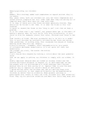 Obesity-proofing our children 183 member. This strategy added such vegetables as squash and bok choy to our meals. Now, years later, both our children not only eat their vegetables and salads without complaint but will order them when they are eating out or complain when their meal does not come with them. It is okay if there are a few foods children genuinely dislike. They should not be forced to eat them. It is when the foods on this list threaten to equal or exceed the foods on the‘ okay to eat’ list that we have a problem. It is not often that I say‘ never’, but please never get in the habit of making a special meal for your child. Only very occasionally, if your child is sick for example, should this occur. Children must learn to eat a wide variety of foods. The most successful way to do this is to model this to your children by constantly introducing new foods and eating them yourselves. If nothing else, this increases the chance of finding healthy foods they will eat readily. A word of warning – remember, after teenagehood hits, your power of influence decreases dramatically. It’ s not quite all over, but essentially the younger you start, the easier the battle. Special time I will finish this chapter by talking a little about the most powerful force that we can apply in getting our children to comply with our wishes. It is doubly important because when we looked at success stress and the success – self-worth mismatch in Chapter 13, on Self-sabotage, we saw how people with low self-esteem will often sabotage their success because they do not feel worthy of it. Special Time is also the most powerful way to improve our child’ s sense of self-worth. I spoke earlier about how children may see you getting angry with them as a positive, in that negative attention can be experienced by children as better than no attention. When parents are busy or preoccupied with issues in their own life, children will seek attention. First they try for positive attention and when this fails they move onto