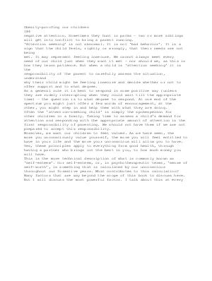 Obesity-proofing our children 184 negative attention. Sometimes they hunt in packs – two or more siblings will get into conflict to bring a parent running.‘ Attention seeking’ is not abnormal. It is not‘ bad behavior’. It is a sign that the child feels, rightly or wrongly, that their needs are not being met. It may represent feeling insecure. We cannot always meet every need of our child just when they want it met – nor should we, as this is how they learn patience. But when a child is‘ attention seeking’ it is the responsibility of the parent to carefully assess the situation, understand why their child might be feeling insecure and decide whether or not to offer support and to what degree. As a general rule it is best to respond in some positive way( unless they are rudely interrupting when they could wait till the appropriate time) – the question is to what degree to respond. At one end of the spectrum you might just offer a few words of encouragement, at the other, you might step in and help them with what they are doing. Often the‘ attention-seeking child’ is simply the spokesperson for other children in a family. Taking time to assess a child’ s demand for attention and responding with the appropriate amount of attention is the first responsibility of parenting. We should not have them if we are not prepared to accept this responsibility. Moreover, we want our children to feel valued. As we have seen, the more you unconsciously value yourself, the more you will feel entitled to have in your life and the more your unconscious will allow you to have. Yes, these principles apply to everything from good health, through having a partner who brings out the best in you, to how much money you will have. This is the more technical description of what is commonly known as‘ self-esteem’. Our self-esteem, or, in psychotherapeutic terms,‘ sense of self-worth’, is something that is calculated by our unconscious throughout our formative years. What contributes to this calculation? Many factors that are way beyond the scope of this book to discuss here. But I will discuss the most powerful factor. I talk about this at every