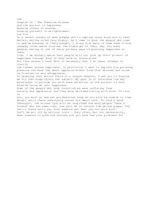 188 Chapter 16 – The Pleasure Paradox and the pursuit of happiness Knowing others is wisdom, knowing yourself is enlightenment. Lao Tzu In a recent survey of what people did to improve their mood and to feel better, eating rated very highly. As I came to know the people who come to see me because of their weight, I found that many of them were living unhappy lives where food was the highlight of their day. For many people, eating is one of their primary ways of pursuing happiness in their life. I am acutely aware that people will not give up their pursuit of happiness through food if they have no alternative. For this reason I have felt it necessary that I at least attempt to clarify the issues around happiness. In particular I want to explain how pursuing pleasure can have the exact opposite effect from that desired and cause us frustration and unhappiness. In reducing this entire field to a single chapter, I ask you to forgive me for over-simplifying the subject. My goal is to introduce the key principles to provide you with some direction in the pursuit of this elusive thing we call happiness. Some of the people who have consulted me were suffering from anxiety and depression and they were self-medicating with food. If this is you, you must go and get professional help as you will be unable to lose weight until these underlying issues are dealt with. To find a good therapist, ask around( you will be surprised how many people‘ have a friend’ who has seen one), see your GP or consult the yellow pages. Try two or three until you find someone you feel you can work with. Don’ t be put off by waiting lists – they often, but not necessarily, mean someone is good and chances are you have had your problems for