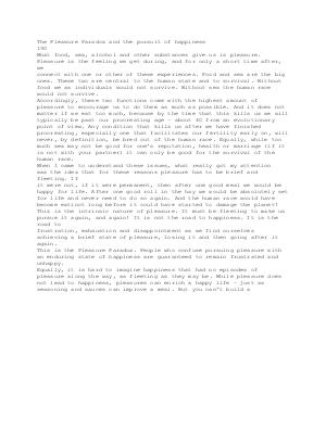 The Pleasure Paradox and the pursuit of happiness 190 What food, sex, alcohol and other substances give us is pleasure. Pleasure is the feeling we get during, and for only a short time after, we connect with one or other of these experiences. Food and sex are the big ones. These two are central to the human state and to survival. Without food we as individuals would not survive. Without sex the human race would not survive. Accordingly, these two functions come with the highest amount of pleasure to encourage us to do them as much as possible. And it does not matter if we eat too much, because by the time that this kills us we will typically be past our procreating age – about 40 from an evolutionary point of view. Any condition that kills us after we have finished procreating, especially one that facilitates our fertility early on, will never, by definition, be bred out of the human race. Equally, while too much sex may not be good for one’ s reputation, health or marriage( if it is not with your partner) it can only be good for the survival of the human race. When I came to understand these issues, what really got my attention was the idea that for these reasons pleasure has to be brief and fleeting. If it were not, if it were permanent, then after one good meal we would be happy for life. After one good roll in the hay we would be absolutely set for life and never need to do so again. And the human race would have become extinct long before it could have started to damage the planet! This is the intrinsic nature of pleasure. It must be fleeting to make us pursue it again, and again! It is not the road to happiness. It is the road to frustration, exhaustion and disappointment as we find ourselves achieving a brief state of pleasure, losing it and then going after it again. This is the Pleasure Paradox. People who confuse pursuing pleasure with an enduring state of happiness are guaranteed to remain frustrated and unhappy. Equally, it is hard to imagine happiness that had no episodes of pleasure along the way, as fleeting as they may be. While pleasure does not lead to happiness, pleasures can enrich a happy life – just as seasoning and sauces can improve a meal. But you can’ t build a