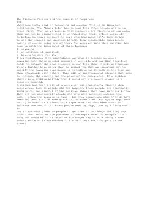 The Pleasure Paradox and the pursuit of happiness 191 wholesome tasty meal on seasoning and sauces. This is an important distinction. The‘ happy life’ has to come from other things and be in place first. Then as we realize that pleasures are fleeting we can enjoy them and not be disappointed or confused when their effect wears off. So before we leave pleasure to move onto happiness let’ s look at how to get the longest and greatest benefit from pleasurable experiences – eating of course being one of them. The research into this question has come up with the importance of three factors: 1. savoring; 2. an attitude of gratitude; 3. having to work for it. I devoted Chapter 8 to mindfulness and what it teaches us about savoring both those special moments in our life and our High Sacrifice Foods to extract the most pleasure we can from them. I will not explore it any further here other than to remind you that an important way to amplify the savoring experience is to talk about it both at the time and then afterwards with others. This adds an interpersonal element that acts to increase the meaning and the power of the experience. If a problem shared is a problem halved, then I would say a pleasure shared is a pleasure doubled. Gratitude has been a bit of a surprise, but consistent, finding when researchers look at people who are happier. These people are constantly looking for and mindful of the positive things they have in their lives. They are not necessarily people who have more material success than most – often the reverse is true – but they appreciate what they do have. Teaching people to be more grateful increases their ratings of happiness. Having to work for a pleasurable experience has also been shown to increase the amount it leaves people feeling happy. Taking a‘ long cut’ is now an exercise given to people to get them to do things the long way around that enhances the pleasure of the experience. An example of a long cut would be to drive or walk a longer way to work along a more scenic route while exercising full mindfulness for that part of the travel.