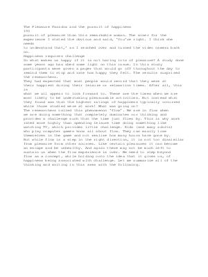 The Pleasure Paradox and the pursuit of happiness 193 pursuit of pleasure than this remarkable woman. The wiser for the experience I stated the obvious and said,‘ You’ re right. I think she needs to understand that,’ as I reached over and turned the video camera back on. Happiness requires challenge So what makes us happy if it is not having lots of pleasure? A study done some years ago has shed some light on this issue. In this study participants were given a pager that would go off throughout the day to remind them to stop and rate how happy they felt. The results surprised the researchers. They had expected that most people would record that they were at their happiest during their leisure or relaxation times. After all, this is what we all appear to look forward to. These are the times when we are most likely to be undertaking pleasurable activities. But instead what they found was that the highest ratings of happiness typically occurred while those studied were at work! What was going on? The researchers called this phenomenon‘ flow’. We are in flow when we are doing something that completely dominates our thinking and provides a challenge such that the time just flies by. This is why work rated more highly than spending leisure time doing something like watching TV, which provides little challenge. Kids( and many adults) who play computer games know all about flow. They can easily lose themselves in the game and not realize how many hours have gone by. But while flow is a step in the right direction, it is not too dissimilar from pleasure from other sources. Like certain pleasures it can become an escape and be unhealthy. And again there may not be much left to sustain us when the flow experience is over. We need to step beyond flow as a concept, while holding onto the idea that it gives us, of happiness being associated with challenge. Let me summarize all of the thinking and writing in this area with the following.