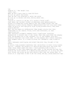 196 Chapter 17 – The weight loss‘ book club’ When we don’ t have time to read the book we just go watch the movie; when we can’ t be bothered to watch the movie we just go to dinner and talk, mostly about sex. My wife( trying to justify to me why it’ s called a‘ book club’) Some years ago top Wall Street stockbrokers were embarrassed by groups of housewives around America who had formed groups that met regularly to pick stocks. Reports demonstrated that not only were these women as good as the high paid, high flying professionals, they were usually better! What did the women do differently? They bought stocks that they researched at two levels. First, with less resources, so less sophistication, they analyzed a prospect company from a traditional financial perspective to ensure that it was sound. Then they qualified the company from the perspective of the consumer. So, if the company sold hair products they went and tried them. If the company was a retail business, they shopped there. If it made clothing for teenagers, they looked at what their teenagers were buying and asked them what they thought of the brand. In short, they assessed something that the boffins in their ivory towers did not – whether the products or service were basically any good! The other thing these women did that I think probably made as big a difference is that they supported each other in the process and had fun. Picking the stock market is a deadly boring exercise. It is only fun when your stocks are going up and very painful when they are going down. To stick at it long-term it has to be fun along the way. Sound familiar? And
