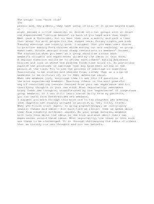 The weight loss‘ book club’ 199 person and, hey presto, they have group of six. If it grows beyond eight it might become a little unwieldy, so divide into two groups with at least one experienced‘ culture bearer’ in each if you have more than eight. Meet once a fortnight, but no less than once a month, and pick a time that works for most people for the longer term. Friday nights are bad; Tuesday evenings are usually good. I suggest that you meet over dinner to practice making food choices while eating out and savoring, as group exercises. Rotate amongst local cheap restaurants or members’ houses. The discussion when you meet as a group should be around each member’ s thoughts and experiences guided by the ideas in this book. A regular exercise should be to review each others’ Eating Awareness Diaries and look at where the problem foods have snuck in. In particular explore the processes of sabotage that may have been acting on the person at the time. Try to see the process of sabotage as something fascinating to be studied and learned from, rather than as a sign of weakness to be critical of, or to feel defensive about. When new members join, encourage them to ask lots of questions of the more experienced members. Teaching others is the most powerful way of consolidating lessons learned from your own experience and for clarifying thoughts in your own mind. Most importantly, newcomers bring fresh new thoughts, unadulterated by the‘ experience’ of longerterm group members. If I can still learn almost daily from my patients, you can learn from fresh-minded new members. I suggest you work through this book one to two chapters per meeting( the chapters are roughly grouped in pairs e. g. 7 & 8, 11 & 12, 13 & 14). When you finish start again. In group psychotherapy, we continually revisit themes and ideas – but each time we revisit them we speak about them from slightly different angles. As your group matures, members will talk less about the ideas in the book and more about their own experiences around these ideas. Most importantly, the ideas in this book are there to be challenged. It is through challenging the ideas of others that we clarify our own thoughts and our own beliefs.