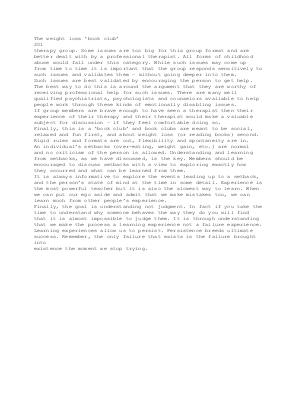 The weight loss‘ book club’ 201 therapy group. Some issues are too big for this group format and are better dealt with by a professional therapist. All forms of childhood abuse would fall under this category. While such issues may come up from time to time it is important that the group responds sensitively to such issues and validates them – without going deeper into them. Such issues are best validated by encouraging the person to get help. The best way to do this is around the argument that they are worthy of receiving professional help for such issues. There are many well qualified psychiatrists, psychologists and counselors available to help people work through these kinds of emotionally disabling issues. If group members are brave enough to have seen a therapist then their experience of their therapy and their therapist would make a valuable subject for discussion – if they feel comfortable doing so. Finally, this is a‘ book club’ and book clubs are meant to be social, relaxed and fun first, and about weight loss( or reading books) second. Rigid rules and formats are out, flexibility and spontaneity are in. An individual’ s setbacks( over-eating, weight gain, etc.) are normal and no criticism of the person is allowed. Understanding and learning from setbacks, as we have discussed, is the key. Members should be encouraged to discuss setbacks with a view to exploring exactly how they occurred and what can be learned from them. It is always informative to explore the events leading up to a setback, and the person’ s state of mind at the time in some detail. Experience is the most powerful teacher but it is also the slowest way to learn. When we can put our ego aside and admit that we make mistakes too, we can learn much from other people’ s experience. Finally, the goal is understanding not judgment. In fact if you take the time to understand why someone behaves the way they do you will find that it is almost impossible to judge them. It is through understanding that we make the process a learning experience not a failure experience. Learning experiences allow us to persist. Persistence breeds ultimate success. Remember, the only failure that exists is the failure brought into existence the moment we stop trying.