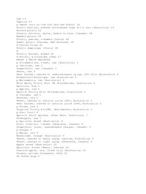 Yam 13 Tapioca 13 p Sweet corn on the cob( boiled 20min) 14 Potato Pontiac, peeled microwaved high 6-7.5 min( Australia) 14 Boiled potato 16 Potato, Ontario, white, baked in skin( Canada) 18 Mashed potato 18 Potato, peeled, steamed( India) 18 Sweet potato( Canada, New Zealand) 18 X French fries 22 Potato dumplings( Italy) 24 X Potato, Russet, Baked 26 X Potato, microwaved( USA) 27 FRUIT & FRUIT PRODUCTS p Strawberries, fresh, raw( Australia) 1 p Cherries, raw 3 Grapefruit, raw( Canada) 3 Pears, raw 4 Pear halves, canned in reduced-sugar syrup, SPC Lite( Australia) 4 Rockmelon / Cantaloupe, raw( Australia) 4 p Watermelon, raw( Australia) 4 Wild Berry Fruity Bitz TM( Blackmores, Australia) 4 Apricots. Raw 5 p Apples, raw 5 Apricot Fruity Bitz( Blackmores, Australia) 5 p Oranges, raw 5 Peaches, raw 5 Peach, canned in natural juice( SPC, Australia) 5 Pear halves, canned in natural juice( SPC, Australia) 5 p Plums, raw 5 Tropical Fruity BitzTM,( Blackmores, Australia) 5 p Kiwi fruit 6 Apricot fruit spread,( Glen Ewin. Australia) 7 Pineapple, raw 7 p Apricots dried( Australia) 8 Fruit Cocktail. canned( Delmonte. Canada) 9 Grapefruit juice. unsweetened( Sunpac. Canada) 9 p Grapes 9 p Mango, raw 9 Marmalade. orange( Australia) 9 Peach, canned in heavy syrup( Letona, Australia) 9 Peach, canned in light syrup( Delmonte, Canada) 9 Apple dried( Australia) 10 Apricots. dried( Wasco, Canada) 10 Custard apple. raw. flesh only( Australia) 10 Prunes, pitted( Sunsweet, USA) 10 GL Table Page 2