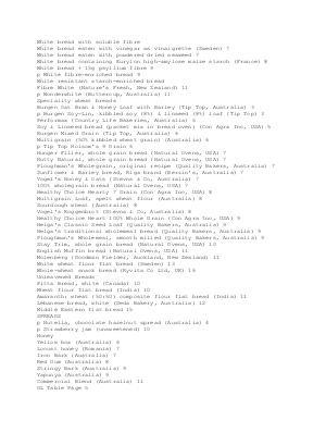 White bread with soluble fibre White bread eaten with vinegar as vinaigrette( Sweden) 7 White bread eaten with powdered dried seaweed 7 White bread containing Eurylon high-amylose maize starch( France) 8 White bread + 15g psyllium fibre 9 p White fibre-enriched bread 9 White resistant starch-enriched bread Fibre White( Nature ' s Fresh, New Zealand) 11 p Wonderwhite( Buttercup, Australia) 11 Speciality wheat breads Burgen Oat Bran & Honey Loaf with Barley( Tip Top, Australia) 3 p Burgen Soy-Lin, kibbled soy( 8 %) & linseed( 8 %) loaf( Tip Top) 3 Performax( Country Life Bakeries, Australia) 5 Soy & Linseed bread( packet mix in bread oven)( Con Agra Inc, USA) 5 Burgen Mixed Grain( Tip Top, Australia) 6 Multigrain( 50 % kibbled wheat grain)( Australia) 6 p Tip Top Holsom ' s 9 Grain 6 Hunger Filler, whole grain bread( Natural Ovens, USA) 7 Nutty Natural, whole grain bread( Natural Ovens, USA) 7 Ploughman ' s Wholegrain, original recipe( Quality Bakers, Australia) 7 Sunflower & Barley bread, Riga brand( Berzin ' s, Australia) 7 Vogel ' s Honey & Oats( Stevns & Co, Australia) 7 100 % wholegrain bread( Natural Ovens, USA) 7 Healthy Choice Hearty 7 Grain( Con Agra Inc, USA) 8 Multigrain Loaf, spelt wheat flour( Australia) 8 Sourdough wheat( Australia) 8 Vogel ' s Roggenbrot( Stevns & Co, Australia) 8 Healthy Choice Heart 100 % Whole Grain( Con Agra Inc, USA) 9 Helga ' s Classic Seed Loaf( Quality Bakers, Australia) 9 Helga ' s traditional wholemeal bread( Quality Bakers, Australia) 9 Ploughman ' s Wholemeal, smooth milled( Quality Bakers, Australia) 9 Stay Trim, whole grain bread( Natural Ovens, USA) 10 English Muffin bread( Natural Ovens, USA) 11 Molenberg( Goodman Fielder, Auckland, New Zealand) 11 White wheat flour flat bread( Sweden) 13 Whole-wheat snack bread( Ryvita Co Ltd, UK) 16 Unleavened Breads Pitta Bread, white( Canada) 10 Wheat flour flat bread( India) 10 Amaranth: wheat( 50:50) composite flour flat bread( India) 11 Lebanese bread, white( Seda Bakery, Australia) 12 Middle Eastern flat bread 15 SPREADS p Nutella, chocolate hazelnut spread( Australia) 4 p Strawberry jam( unsweetened) 10 Honey Yellow box( Australia) 6 Locust honey( Romania) 7 Iron Bark( Australia) 7 Red Gum( Australia) 8 Stringy Bark( Australia) 9 Yapunya( Australia) 9 Commercial Blend( Australia) 11 GL Table Page 5