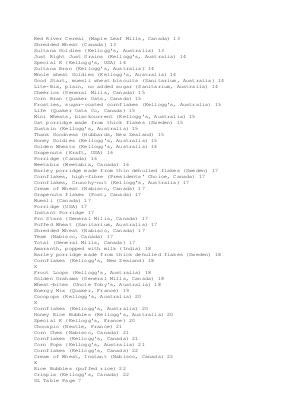 Red River Cereal( Maple Leaf Mills, Canada) 13 Shredded Wheat( Canada) 13 Sultana Goldies( Kellogg ' s, Australia) 13 Just Right Just Grains( Kellogg ' s, Australia) 14 Special K( Kellogg ' s, USA) 14 Sultana Bran( Kellogg ' s, Australia) 14 Whole wheat Goldies( Kellogg ' s, Australia) 14 Good Start, muesli wheat biscuits( Sanitarium, Australia) 14 Lite-Bix, plain, no added sugar( Sanitarium, Australia) 14 Cheerios( General Mills, Canada) 15 Corn Bran( Quaker Oats, Canada) 15 Frosties, sugar-coated cornflakes( Kellogg ' s, Australia) 15 Life( Quaker Oats Co, Canada) 15 Mini Wheats, blackcurrent( Kellogg ' s, Australia) 15 Oat porridge made from thick flakes( Sweden) 15 Sustain( Kellogg ' s, Australia) 15 Thank Goodness( Hubbards, New Zealand) 15 Honey Goldies( Kellogg ' s, Australia) 15 Golden Wheats( Kellogg ' s, Australia) 16 Grapenuts( Kraft, USA) 16 Porridge( Canada) 16 Weetabix( Weetabix, Canada) 16 Barley porridge made from thin dehulled flakes( Sweden) 17 Cornflakes, high-fibre( Presidents ' Choice, Canada) 17 Cornflakes, Crunchy-nut( Kellogg ' s, Australia) 17 Cream of Wheat( Nabisco, Canada) 17 Grapenuts flakes( Post, Canada) 17 Muesli( Canada) 17 Porridge( USA) 17 Instant Porridge 17 Pro Stars( General Mills, Canada) 17 Puffed Wheat( Sanitarium, Australia) 17 Shredded Wheat( Nabisco, Canada) 17 Team( Nabisco, Canada) 17 Total( General Mills, Canada) 17 Amaranth, popped with milk( India) 18 Barley porridge made from thick dehulled flakes( Sweden) 18 Cornflakes( Kellogg ' s, New Zealand) 18 X Froot Loops( Kellogg ' s, Australia) 18 Golden Grahams( General Mills, Canada) 18 Wheat-bites( Uncle Toby ' s, Australia) 18 Energy Mix( Quaker, France) 19 Cocopops( Kellogg ' s, Australia) 20 X Cornflakes( Kellogg ' s, Australia) 20 Honey Rice Bubbles( Kellogg ' s, Australia) 20 Special K( Kellogg ' s, France) 20 Chocapic( Nestle, France) 21 Corn Chex( Nabisco, Canada) 21 Cornflakes( Kellogg ' s, Canada) 21 Corn Pops( Kellogg ' s, Australia) 21 Cornflakes( Kellogg ' s, Canada) 22 Cream of Wheat, Instant( Nabisco, Canada) 22 X Rice Bubbles( puffed rice) 22 Crispix( Kellogg ' s, Canada) 22 GL Table Page 7
