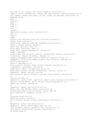 Low fat, fruit, sugar, Ski( Dairy Farmers, Australia) 10 Yoghurt drink, reduced-fat, Vaalia TM, passionfruit( Pauls, Australia) 11 Soy yoghurt, peach and mango, 2 % fat, sugar( So Natural, Australia) 13 PROTEIN FOODS Beef 0 Cheese 0 Eggs 0 Fish 0 Lamb 0 Pork 0 Salami 0 Shellfish( prawns, crab, lobster etc) 0 Tuna 0 Veal 0 SOUPS Noodle soup( Turkish soup with stock and noodles) 0 Tomato soup( Canada) 6 Minestrone, Country ladle TM( Campbell ' s, Australia) 7 lentil, canned( Unico, Canada) 9 Split Pea( Wil-Pak, USA) 16 Black Bean( WiI-Pack, USA) 17 Green Pea, canned( Campbell ' s, Canada) 27 PASTA & NOODLES p Split pea and soy pasta shells, gluten-free( Orgran. Australia) 9 Tortellini, cheese( Stouffer, Canada) 10 Lungkow mungbeanthread noodles( National Cereals, China) 12 Spaghetti, protein enriched, boiled 7 min( Catelli, Canada) 14 p Fettucine, egg 15 Ravioli( Australia) 15 Rice noodles, freshly made, boiled( Sydney, Australia) 15 p Spaghetti, wholemeal, boiled 16 Vermicelli. White, boiled( Australia) 16 Mung bean noodles( Longkou beanthread)( Yantai, China) 18 Spaghetti, white, boiled 5 min 18 Star Pastina, white, boiled 5 minutes( Lancia-Bravo, Canada) 18 X Instant noodles 19 Spaghetti, gluten-free, canned in tomato sauce( Orgran, Australia) 19 Spirali, durum wheat, white. boiled( Vetta, Australia) 19 Capellini( Primo, Canada) 20 X Spaghetti, white, boiled 10-15 min 21 Fettucine, egg( Mother Earth, Australia) 22 Gluten-free pasta, maize starch, boiled( UK) 22 Rice vermicelli, Kongmoon( China) 22 X Linguine thick / thin 23 Macaroni, plain, boiled 23 Rice noodles, dried, boiled( Thai World, Thailand) 23 X Spaghetti, white, boiled 20 min 27 Spaghetti, white, durum wheat semolina 28 Udon noodles, plain. reheated 5 min( Australia) 30 Corn pasta, gluten-free( Orgran, Australia) 32 GL Table Page 11