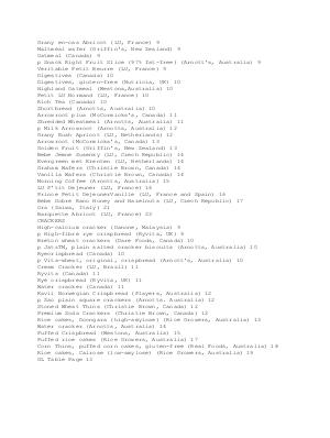 Grany en-cas Abricot( LU, France) 9 Maltmeal wafer( Griffin ' s, New Zealand) 9 Oatmeal( Canada) 9 p Snack Right Fruit Slice( 97 % fat-free)( Arnott ' s, Australia) 9 Veritable Petit Beurre( LU, France) 9 Digestives( Canada) 10 Digestives, gluten-free( Nutricia, UK) 10 Highland Oatmeal( Westons, Australia) 10 Petit LU Normand( LU, France) 10 Rich Tea( Canada) 10 Shortbread( Arnotts, Australia) 10 Arrowroot plus( McCormicks ' s, Canada) 11 Shredded Wheatmeal( Arnotts, Australia) 11 p Milk Arrowroot( Arnotts, Australia) 12 Grany Rush Apricot( LU, Netherlands) 12 Arrowroot( McCormicks ' s, Canada) 13 Golden Fruit( Griffin ' s, New Zealand) 13 Bebe Jemne Susenky( LU, Czech Republic) 14 Evergreen met Krenten( LU, Netherlands) 14 Graham Wafers( Christie Brown, Canada) 14 Vanilla Wafers( Christie Brown, Canada) 14 Morning Coffee( Arnotts, Australia) 15 LU P ' tit Dejeuner( LU, France) 16 Prince Petit DejeunerVanille( LU, France and Spain) 16 Bebe Dobre Rano Honey and Hazelnuts( LU, Czech Republic) 17 Ora( Saiwa, Italy) 21 Barquette Abricot( LU, France) 23 CRACKERS High-calcium cracker( Danone, Malaysia) 9 p High-fibre rye crispbread( Ryvita, UK) 9 Breton wheat crackers( Dare Foods, Canada) 10 p JatzTM, plain salted cracker biscuits( Arnotts, Australia) 10 Ryecrispbread( Canada) 10 p Vita-wheat, original, crispbread( Arnott ' s, Australia) 10 Cream Cracker( LU, Brazil) 11 Ryvita( Canada) 11 Rye crispbread( Ryvita, UK) 11 Water cracker( Canada) 11 Kavli Norwegian Crispbread( Players, Australia) 12 p Sao plain square crackers( Arnotts. Australia) 12 Stoned Wheat Thins( Christie Brown, Canada) 12 Premium Soda Crackers( Christie Brown, Canada) 12 Rice cakes, Doongara( high-amylose)( Rice Growers, Australia) 13 Water cracker( Arnotts, Australia) 14 Puffed Crispbread( Westons, Australia) 15 Puffed rice cakes( Rice Growers, Australia) 17 Corn Thins, puffed corn cakes, gluten-free( Real Foods, Australia) 18 Rice cakes, Calrose( low-amylose)( Rice Growers, Australia) 19 GL Table Page 13