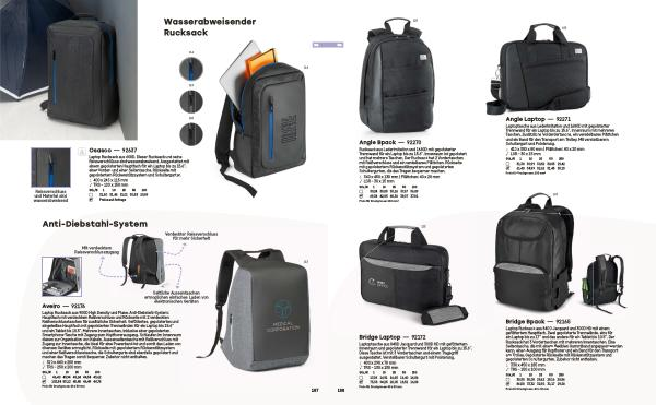Laptop Rucksack aus 900D High Density und Plane . Anti-Diebstahl-System : Hauptfach mit verdecktem Reißverschluss und Rückseite mit 2 verdeckten Reißverschlusstaschen für zusätzliche Sicherheit . Gefüttertes , gepolstertes und eingeteiltes Hauptfach mit gepolsterten Trennwänden für ein Laptop bis 15.6 ‘‘ und ein Tablet bis 10.5 ‘‘. Mehrere Innentaschen , inklusive einer gepolsterten Smartphone-Tasche mit Zugang zum Kopfhörerausgang . Schlaufen im Innenraum dienen zur Organisation von Kabeln . Aussenseitentasche mit Reißverschluss mit Zugang zur Innentasche , die ideal für eine Powerbank ist und somit das Laden von diversen Geräten ermöglicht . Rückseite mit gepolstertem Rückenstützsystem und einer Reißverschlusstasche , die Schultergurte sind ebenfalls gepolstert und machen das Tragen somit bequemer . Zubehör nicht enthalten .