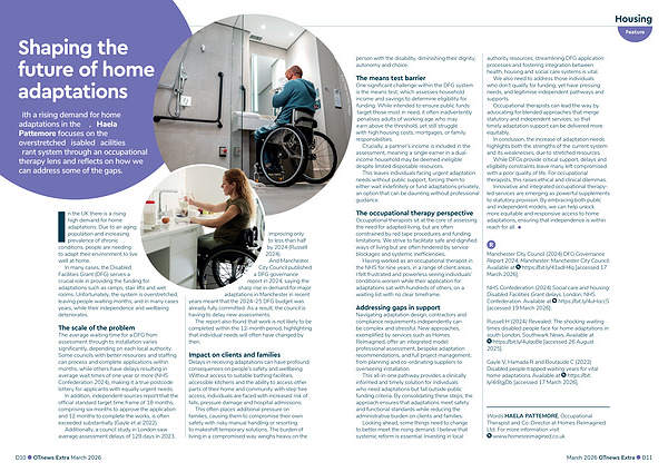 With a rising demand for home adaptations in the UK, Haela Pattemore focuses on the overstretched Disabled Facilities Grant system through an occupational therapy lens and reflects on how we can address some of the gaps.