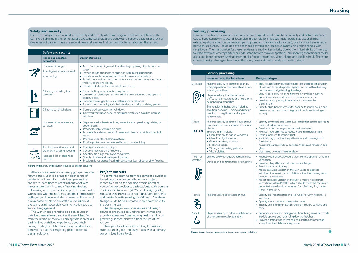 Environmental noise is an issue for many neurodivergent people, due to the anxiety and distress it causes due to hypersensitivity to sound. It can also impact relationships with neighbours if adults or children exhibit repetitive adaptive behaviours( pacing, jumping, banging and shouting), due to noise transmission between properties. Residents have described how this can impact on maintaining relationships with neighbours. Thermal comfort for these residents is another key priority due to the limited ability of many to tolerate extremes of temperature or understand how to make adaptations. Neurodivergent residents could also experience sensory overload from smell of food preparation, visual clutter and tactile stimuli. There are different design strategies to address these key issues at design and construction stage.