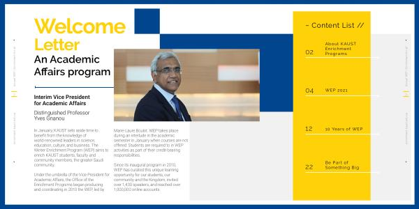 In January , KAUST sets aside time to benefit from the knowledge of world-renowned leaders in science , education , culture , and business . The Winter Enrichment Program ( WEP ) aims to enrich KAUST students , faculty and community members , the greater Saudi community .