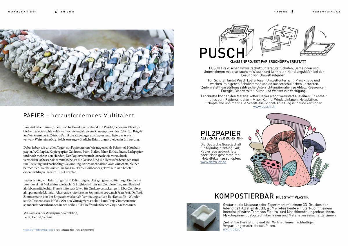 Papier ermöglicht Erfahrungen und Erfindungen: Dies gilt genauso für junge Kinder auf Low-Level mit Makulatur wie auch für Hightech-Profis mit Zellulosefilm, zum Beispiel als lebensmittelechter Kunststoffersatz( etwa für Gurkenverpackungen). Über Zellulose als spannende Material-Alternative referierte im September 2025 auch Frau Prof. Dr. Tanja Zimmermann von der Empa am werken. ch-Vernetzungsanlass R: « Rohstoffe – Wunderstoffe: Tausendsassa Holz ». Wer den Vortrag verpasst hat, kann Tanja Zimmermanns spannende Ausführungen in der Reihe « ETH Treffpunkt Science City » nachschauen.