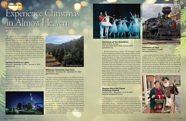 Lovers of the Christmas classic , “ The Polar Express ” will delight in the 75-90-minute steam-powered adventure of Christmas at Cass . Departing the Cass Depot and winding its way down the beautiful Greenbrier River , guests are given the chance to experience the picturesque town of Cass like never before . With beautifully decorated and heated coaches , this journey is sure to make anyone believe in the magic of the holiday season . Head over to the website and reserve your seats soon , as tickets for this event sell out quickly . Kids under the age of 3 ride for free . •
