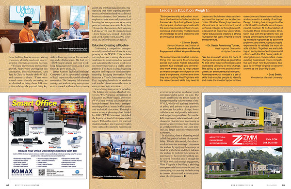 Cultivating a competitive , entrepreneurially minded workforce is a top priority of the WVEE . This includes an emphasis on training the current workforce to meet immediate demand and educating the future workforce on entrepreneurship as a viable career pathway . This focus is already gaining traction in the space of youth entrepreneurship . Bridging Innovation Week features a Youth Entrepreneurship Day , engaging hundreds of students and teachers from across the state in entrepreneurship activities .