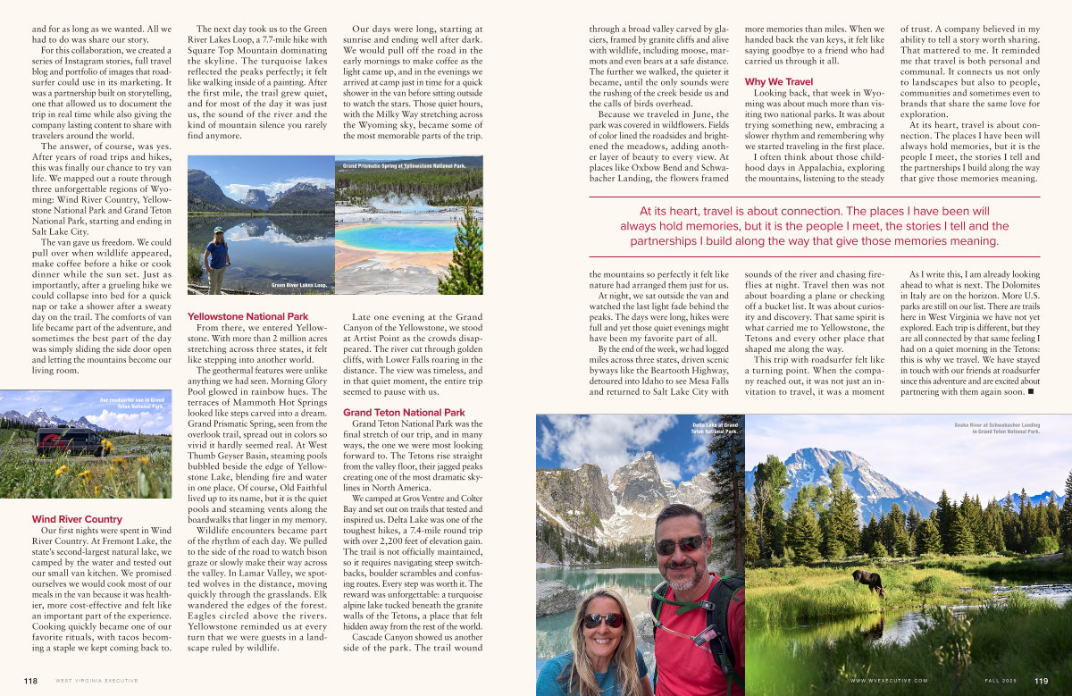 As I write this, I am already looking ahead to what is next. The Dolomites in Italy are on the horizon. More U. S. parks are still on our list. There are trails here in West Virginia we have not yet explored. Each trip is different, but they are all connected by that same feeling I had on a quiet morning in the Tetons: this is why we travel. We have stayed in touch with our friends at roadsurfer since this adventure and are excited about partnering with them again soon. •